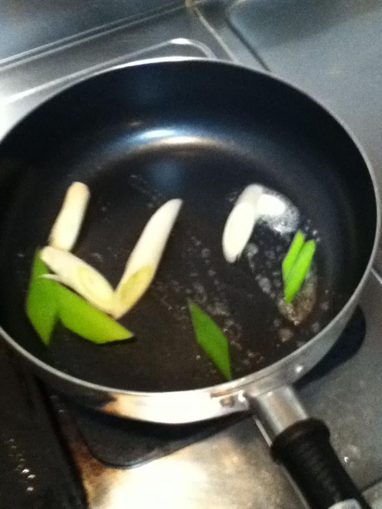 ![]() 鍋をあたためて、バターを溶かし、白ネギを炒める。