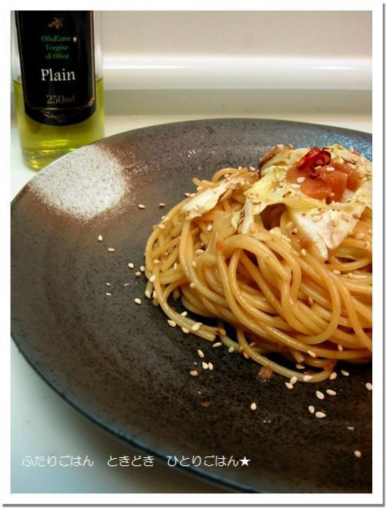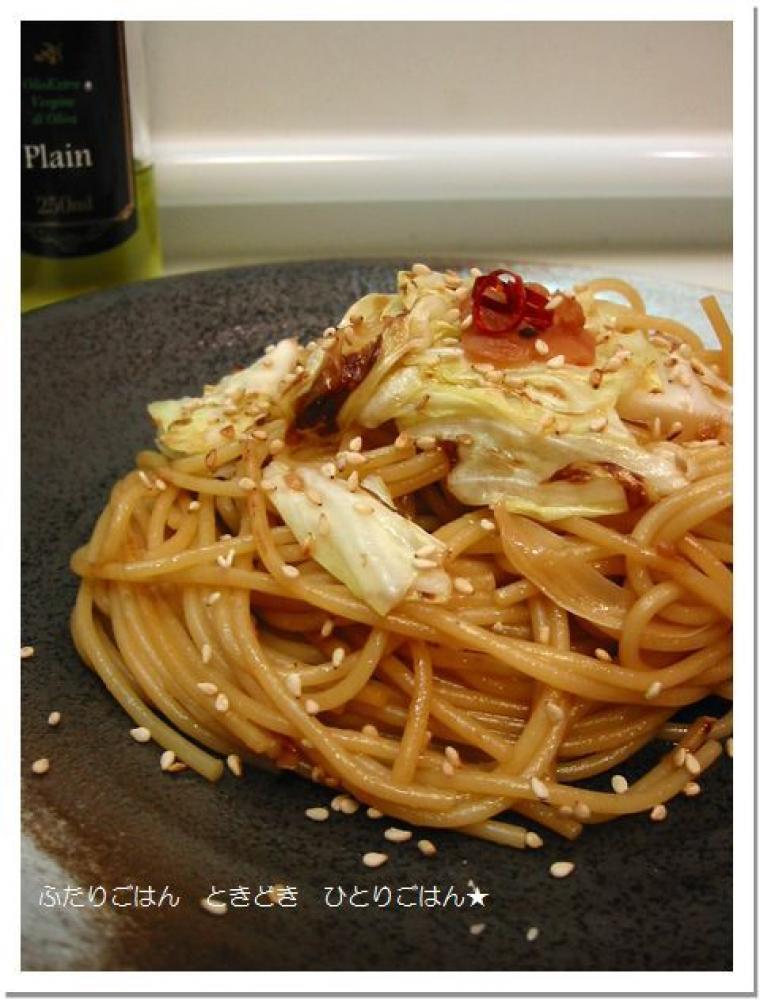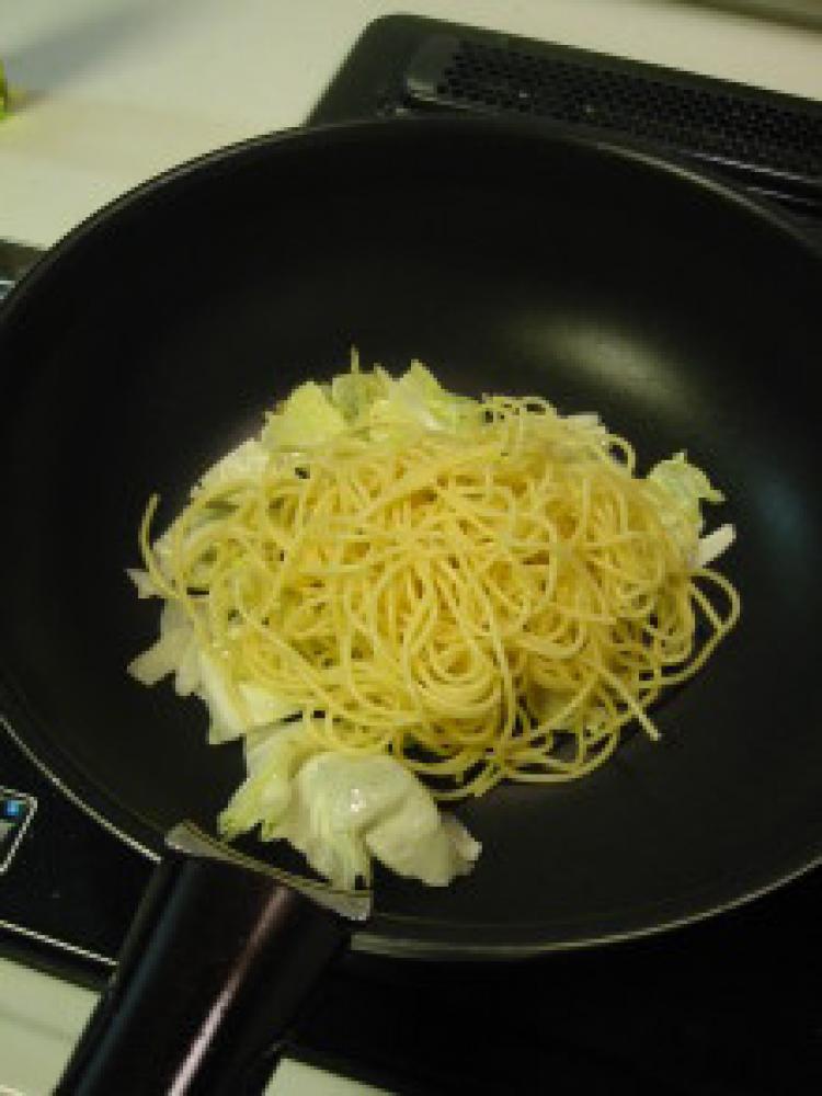 ![]() フライパンにオリーブオイル(分量外)を熱してキャベツ→パスタの順に炒める。