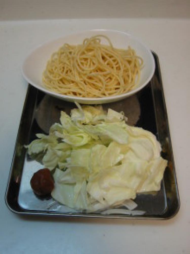 ![]() 梅和えソースで味付けしたら皿に盛り、残りの梅干しをからめながら召し上がれ。