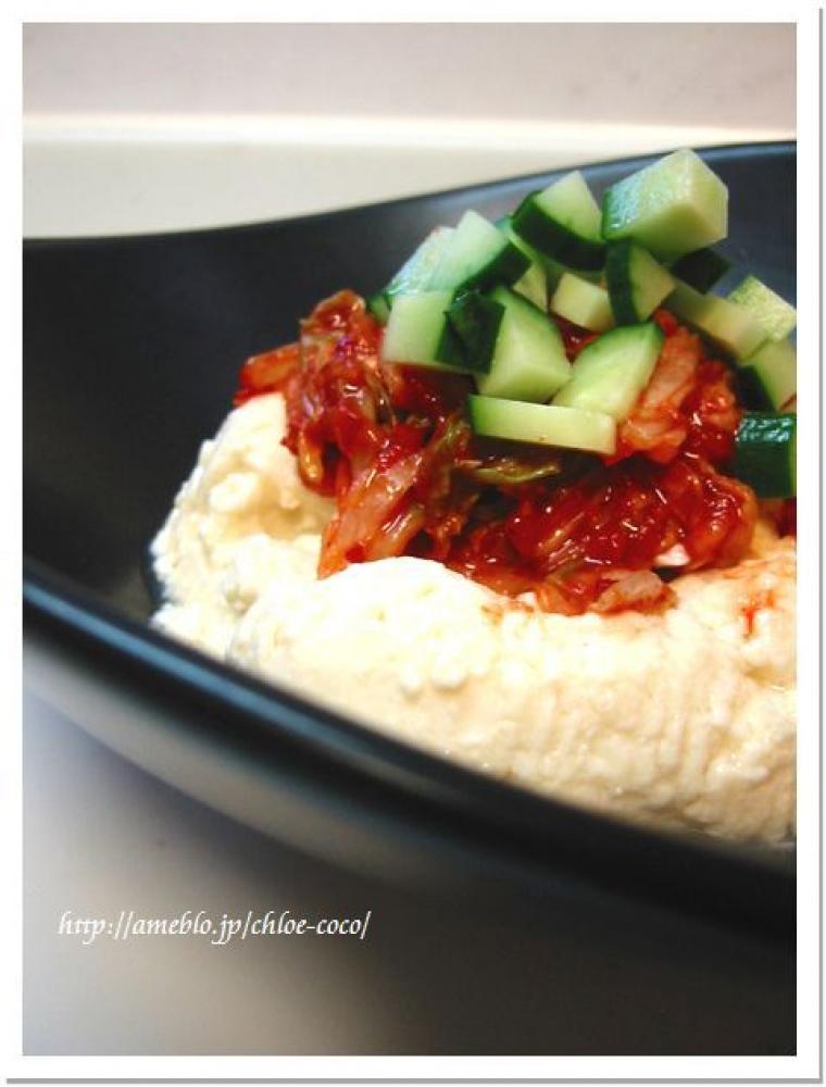 ![]() ①にあられ切りにしたきゅうりとキムチをのせたらできあがり!