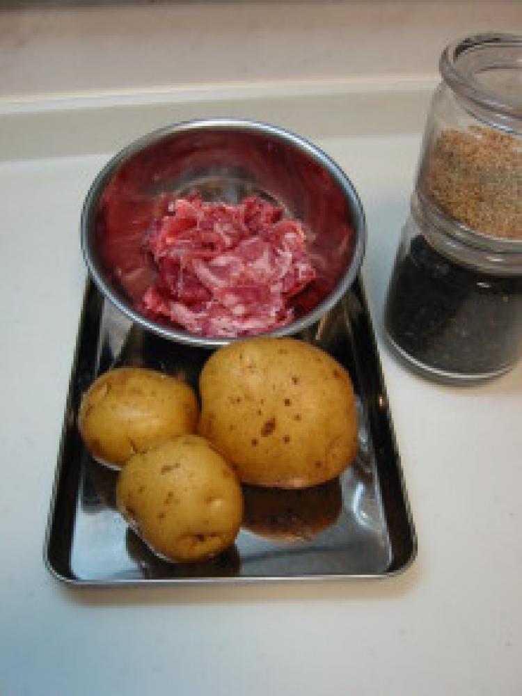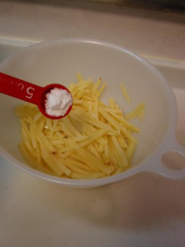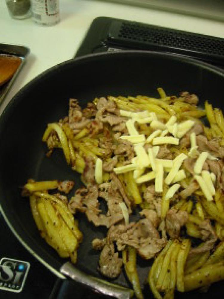 ![]() 下準備:じゃがいもは皮をむき3mmくらいの細切りにする。豚コマは食べやすい大きさにカットする。