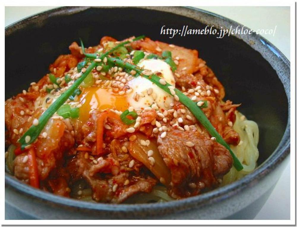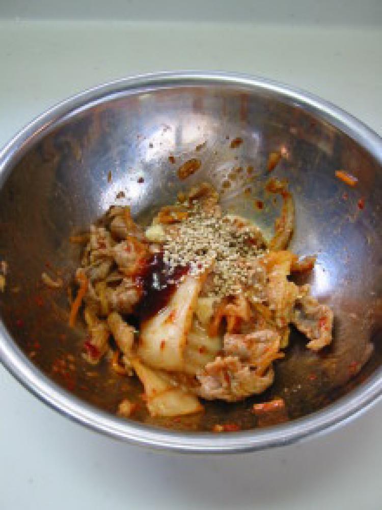 ![]() 沸騰した湯で豚肉を湯がいたら、ボールに移し、キムチと(A)の調味料を味を見ながら加えていく。
