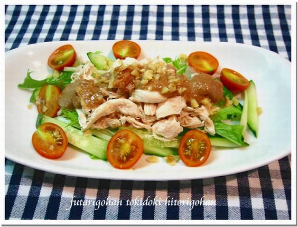 ![]() 野菜、ささみを皿に盛り付け、ソースをたっぷりかけたら出来上がり。お好みで刻んだくるみをかけて下さい。