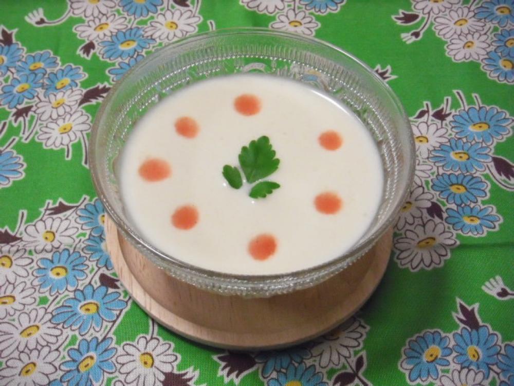 2をしっかりと冷まし、牛乳とともにミキサーにかけ、目の細かいザル等でこしたら、生クリームを加え、塩で味を調える。