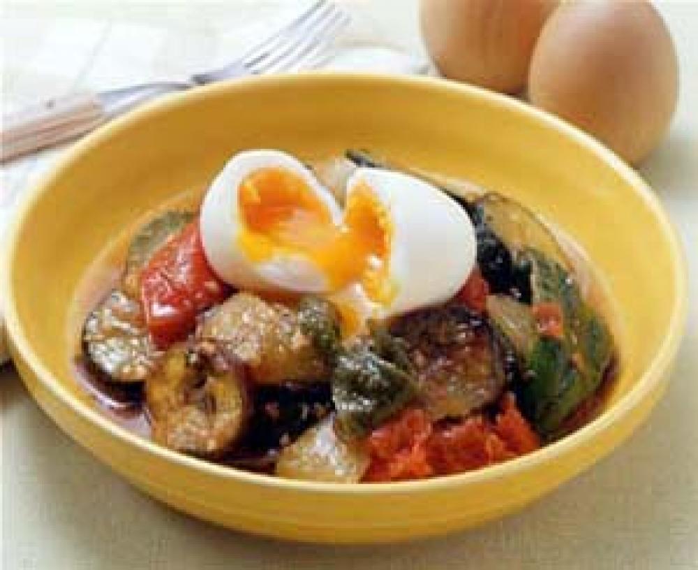 卵は水から火にかけ、沸騰したら4~5分茹で、すぐに冷水に放ち、半熟卵を作る。