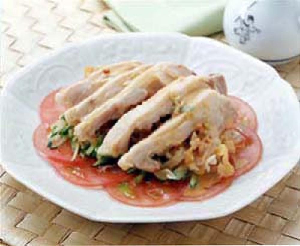 器にきゅうりを盛り、くらげと鶏肉をのせ、たれをかける。