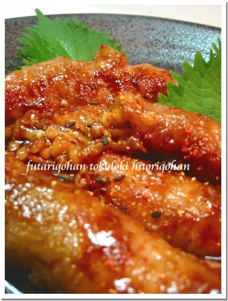 ![]() 熱したフライパンにサラダ油を引き②を焼く。焼けたらキッチンペーパーで余分な脂を拭くと調味料のからみが良くなります。