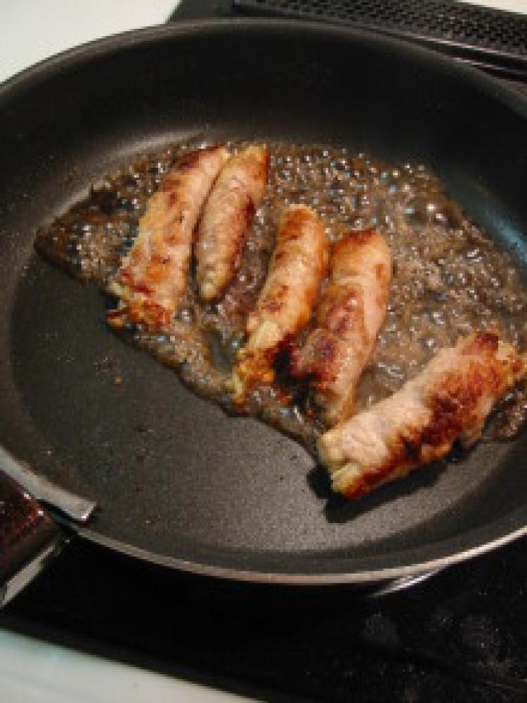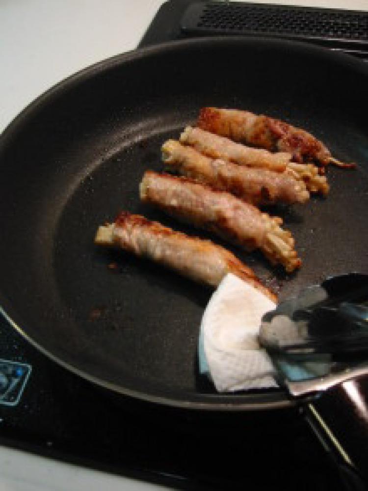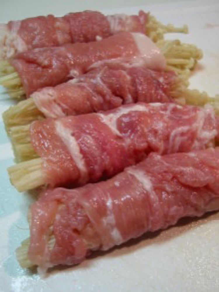 ![]() 豚肉を広げてえのきを巻き、片栗粉を薄くまぶす。