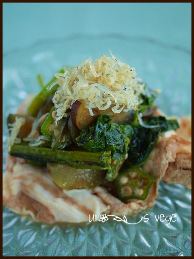 ナスに火が通ったら、つるむらさき・オクラを加えてサッと炒め酒・生姜を加えて炒め最後に麺つゆを加えて炒める。