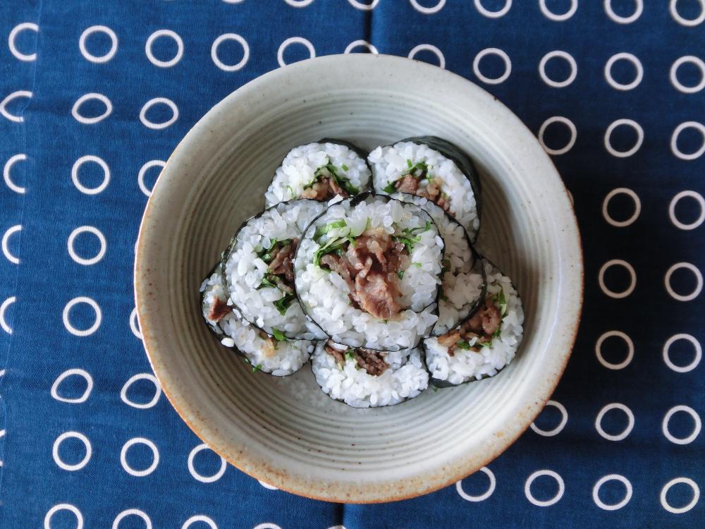 敷いた大葉と針生姜の上によく汁けを切った牛肉を乗せ巻く