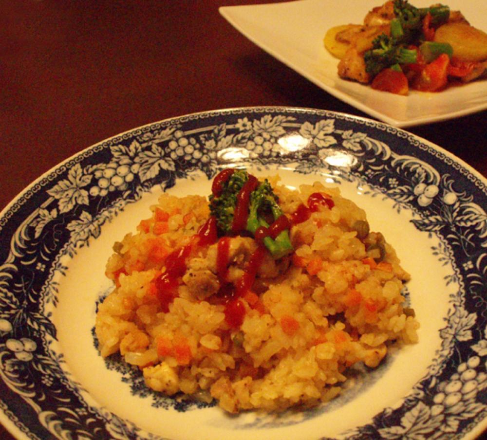 Aと3合分の水を注いでさっと混ぜる。Bと1の鶏肉をのせ、普通に炊く。