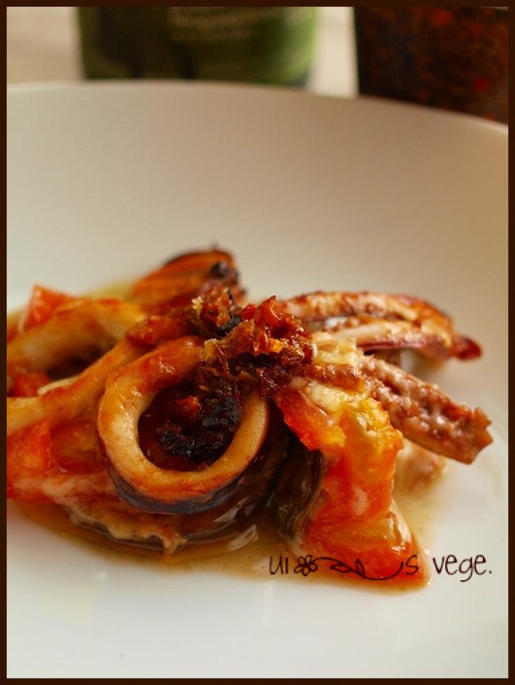ナスの上にトマトを小さく切ったものを入れて、その上に炒めたイカを乗せる。