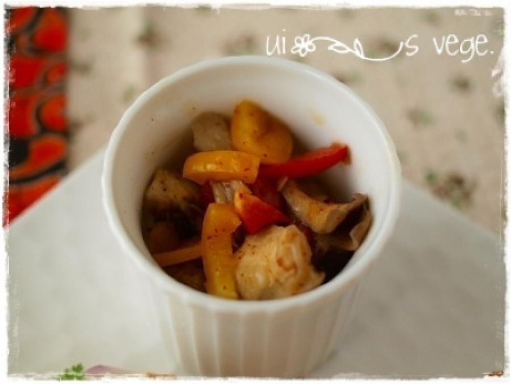炒めた舞茸をボウルに入れワインビネガー・チリペッパー・塩・パプリカを加え全体に合える。