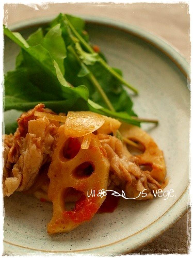 フライパンにオリーブオイルをしき、レンコンを炒め全体に火が通ったら玉ねぎを加えて炒める。