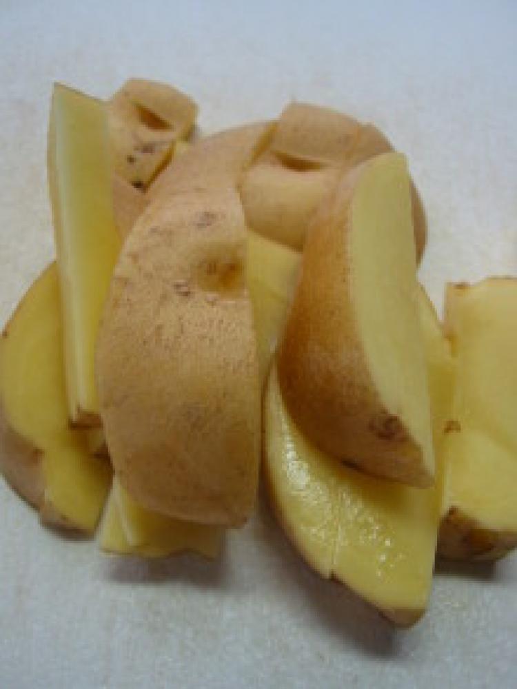 ![]() じゃがいもはよく洗ってくし形に切ります。