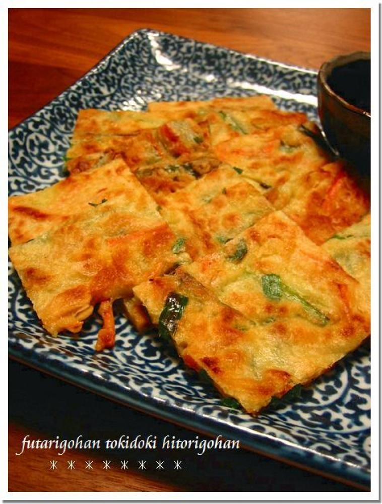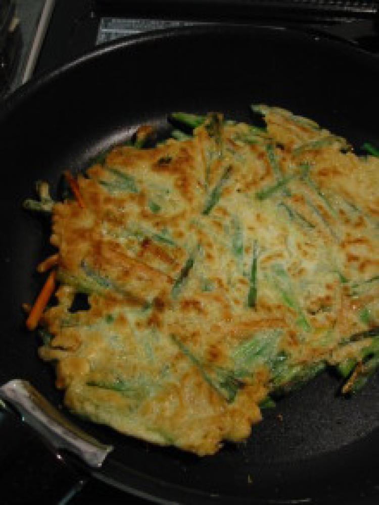 ![]() フライパンにごま油を熱して生地を薄く流し込みます。焼けてきたら鍋肌からごま油を足して、揚げ焼きのようにします。