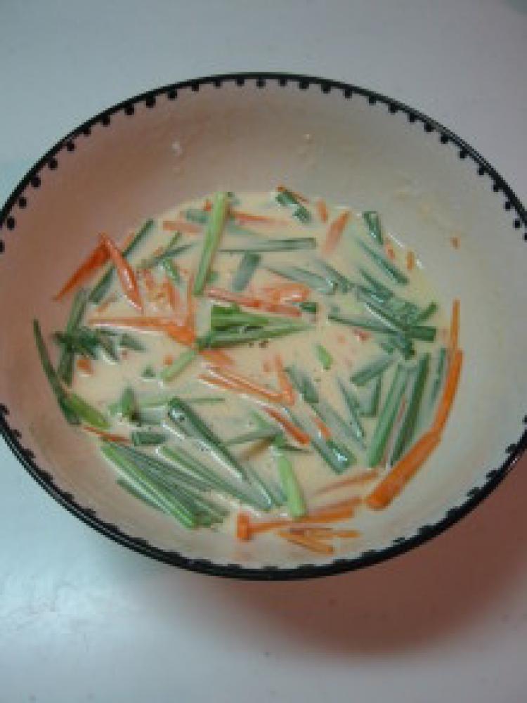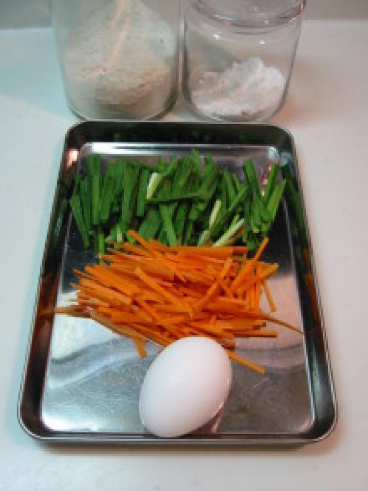 ![]() 下準備:(B)を合わせておく。ニラは3~4㎝長に、人参は細めの千切りにカットしておきます。