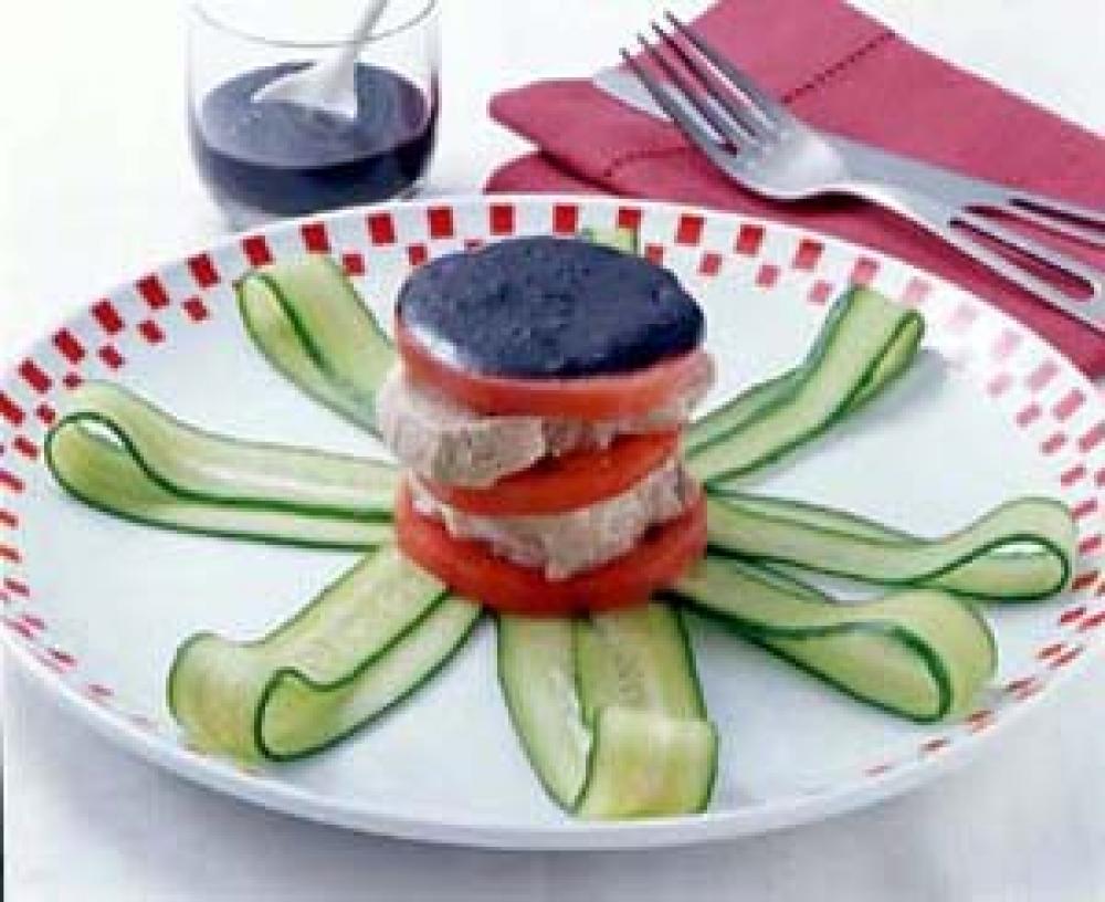 トマトは厚めの輪切り、きゅうりは皮むきでリボン状にスライスする。