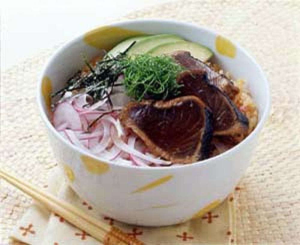 (6)を器に盛り付け、その上にかつお。アボガド、たまねぎ、しそを盛り付け、のりをあしらう。