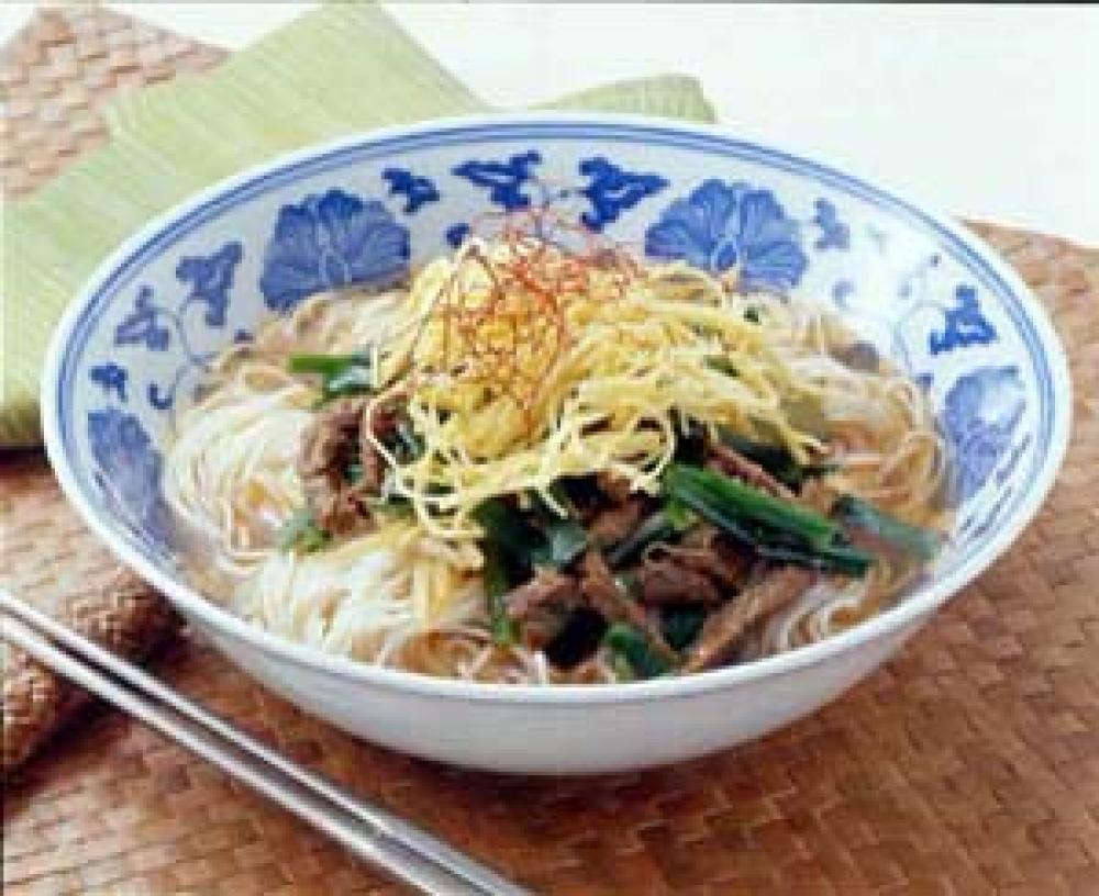 にらを加え、ひと煮立ちしたら火を止め、素麺が入った器に盛り、(4)と糸唐辛子をあしらう。