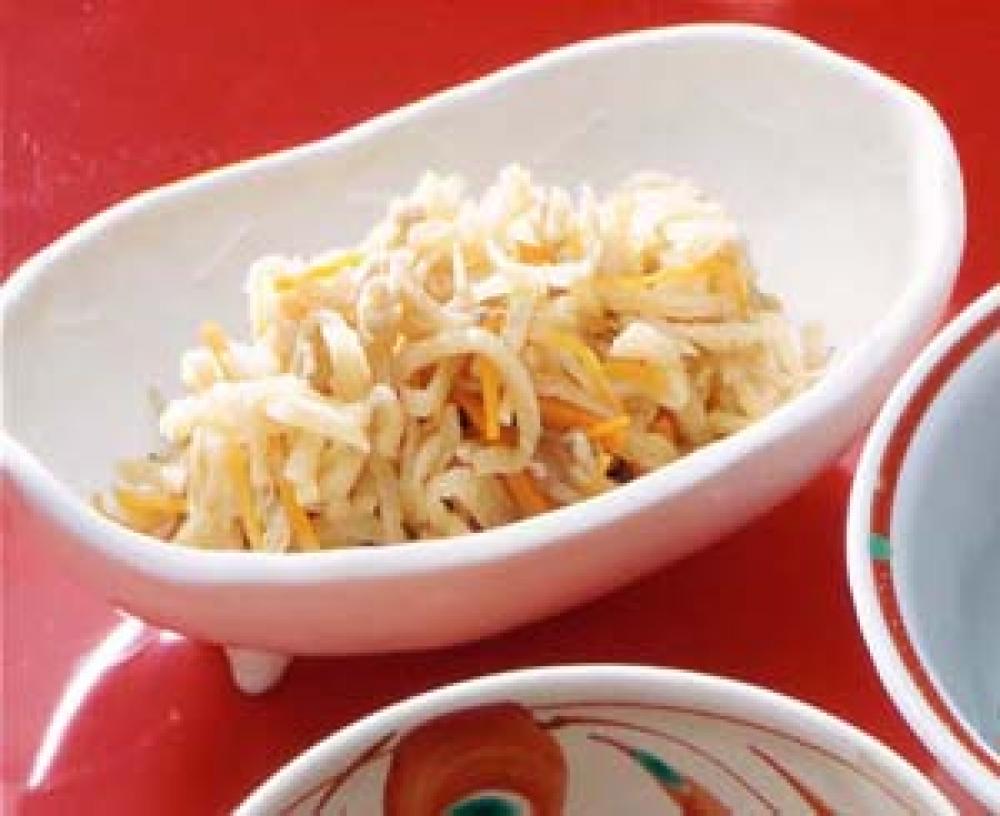 油揚げは熱湯をかけて油抜きし、にんじんは皮をむき、それぞれ4cm長さの千切りにする。