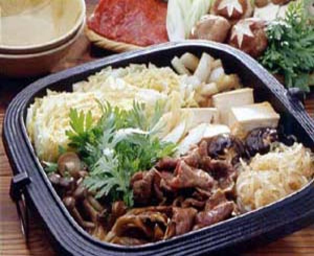 鍋にわりしたを加え、火にかける。煮立ったら肉を加え、次に野菜、しいたけを彩りよく配し、