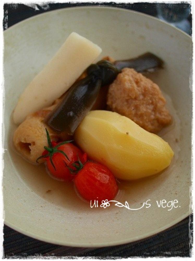 ![]() 大根や卵に味がしみこんだら、白菜・プチトマトを加えて煮込み出来上がり。