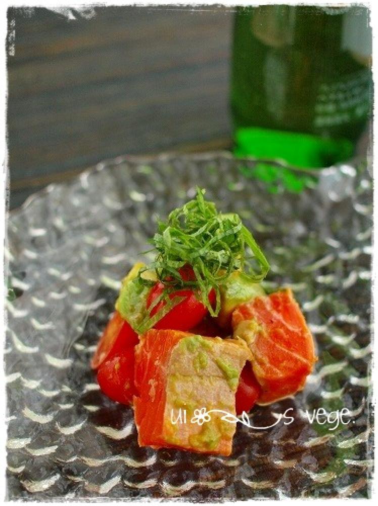 サーモンに塩・胡椒で下味を付ける。アボガドは小さく切り柚子の果汁を絡めておく。プチトマトは半分に、大葉は千切りに。