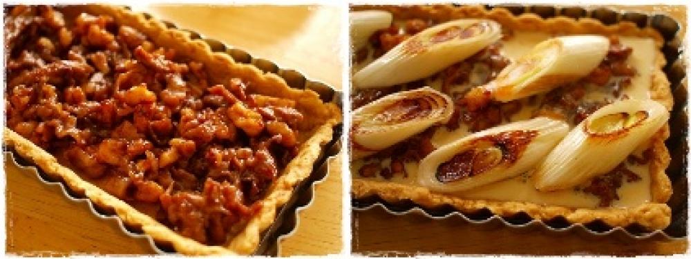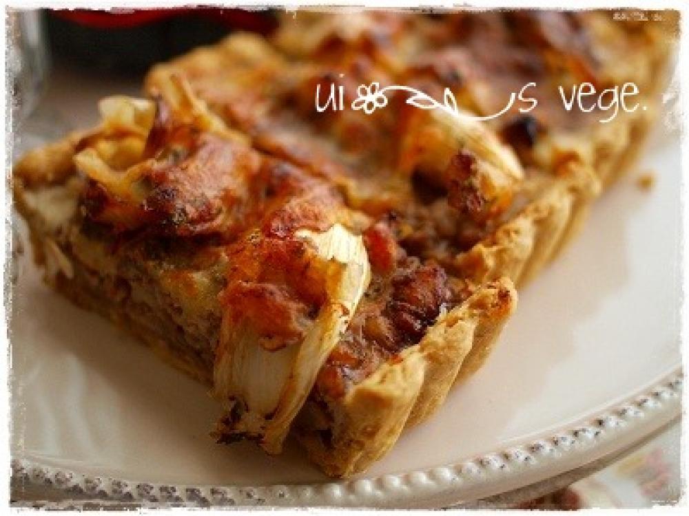味噌が全体に絡まったら、焼いておいた型に均等に乗せ豆乳と卵をよく混ぜたアパレイユを作り、流し込んで上にネギ、チーズを伸せ