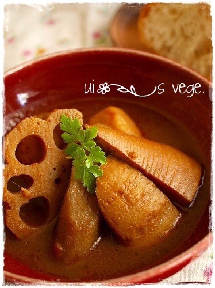 ウスターソースやケチャップ・マンゴーチャツネなどお好みの調味料を入れて味を調えスープが出来たら、煮しめの具を入れてサッと