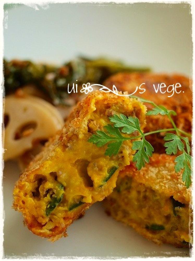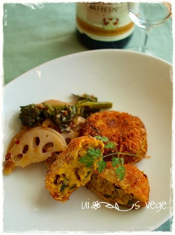 ![]() 2時間程経ったら、冷蔵庫から出し冷たいうちに形を整えて卵・パン粉をつけて揚げていく。