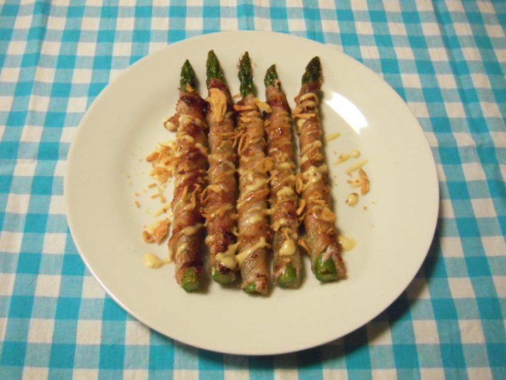アスパラは、下の硬い部分を切り落とし、豚バラ肉の薄切りをぐるぐる巻きつけて、塩こしょうをする。