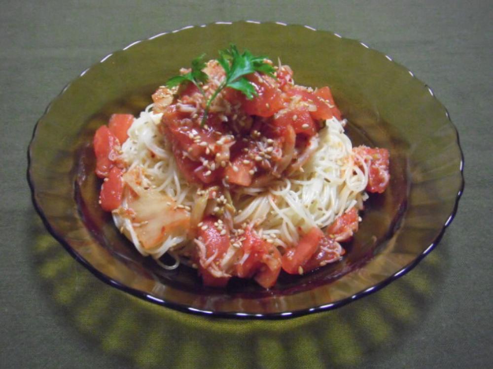 トマトは皮を湯むきし食べやすい1口大の大きさに切り、キムチ、シラス、醤油、ごま油Aとともに和え冷蔵庫で冷やしておく。