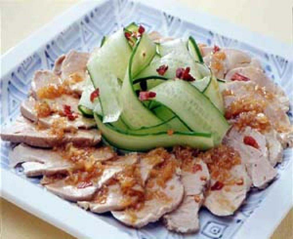 豚ヒレ肉は塊のまま皿にのせ、酒をふり、蒸し器で30分蒸し、十分冷まし、薄切りにする。
