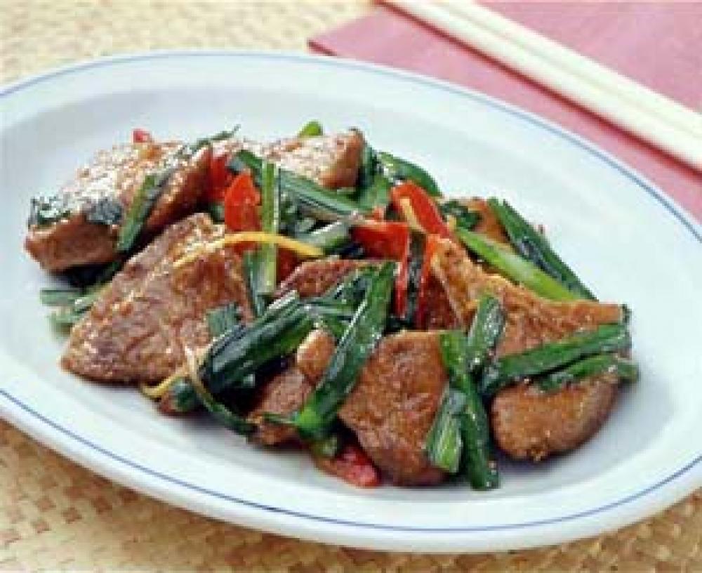 テフロン加工のフライパンに小さじ1杯の油をひき、しょうがを炒め、香りが出たら、にら、赤ピーマンを加え炒める。