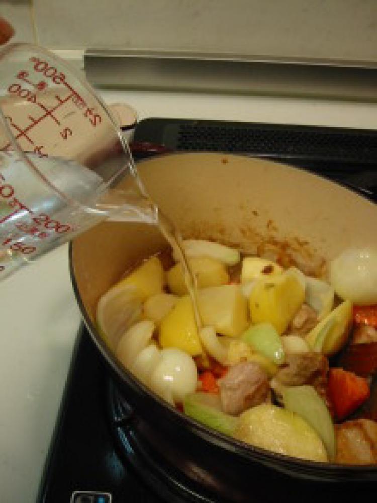 ![]() 水を加えてコンソメを入れ、煮込みます。