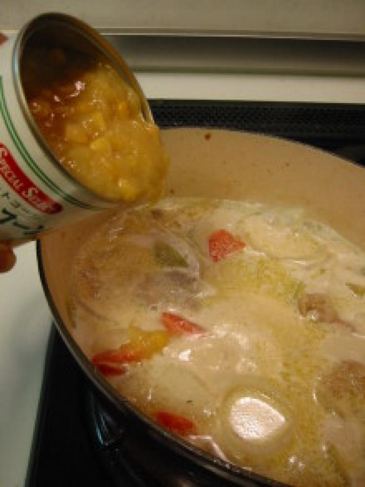 ![]() コーン缶を加えてさらにひと煮立ち。塩こしょうで味を整えたら完成です!
