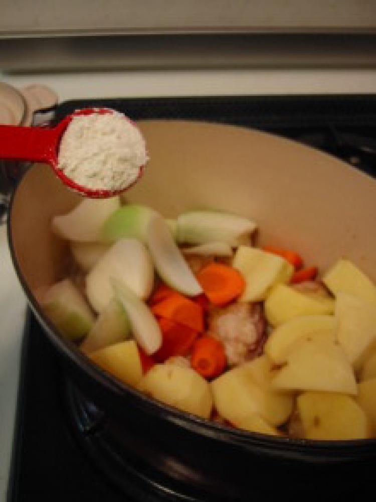 小麦粉を振り入れて全体にしっかりまぶします。 |