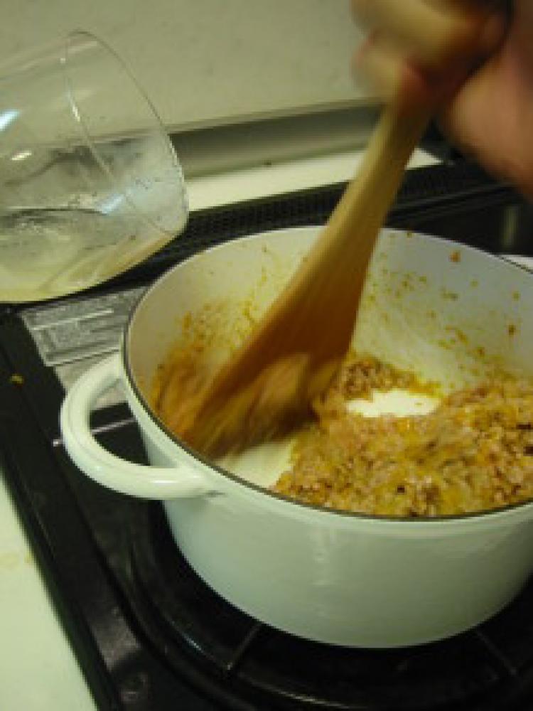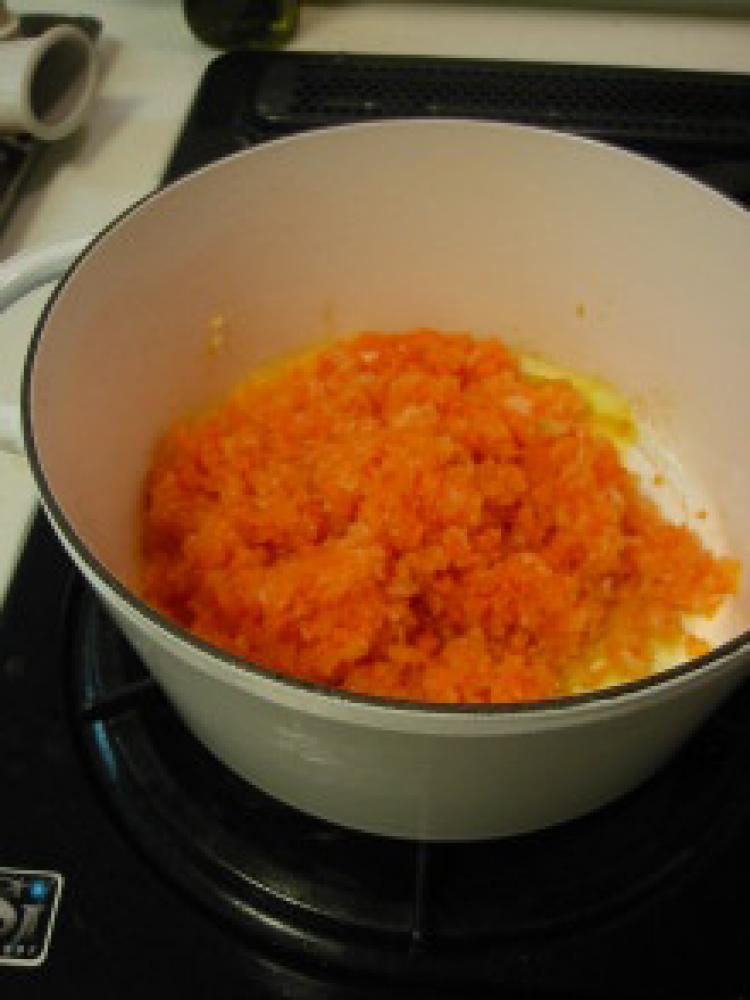![]() オリーブオイルを熱した鍋に、みじん切りにした野菜にスパイスを投入~。