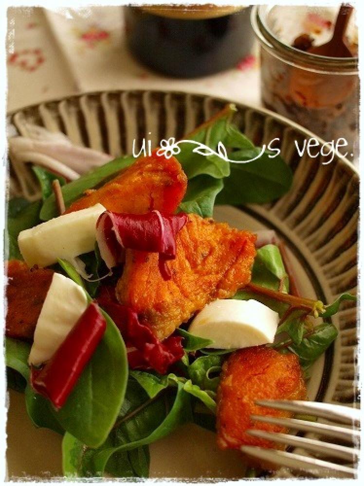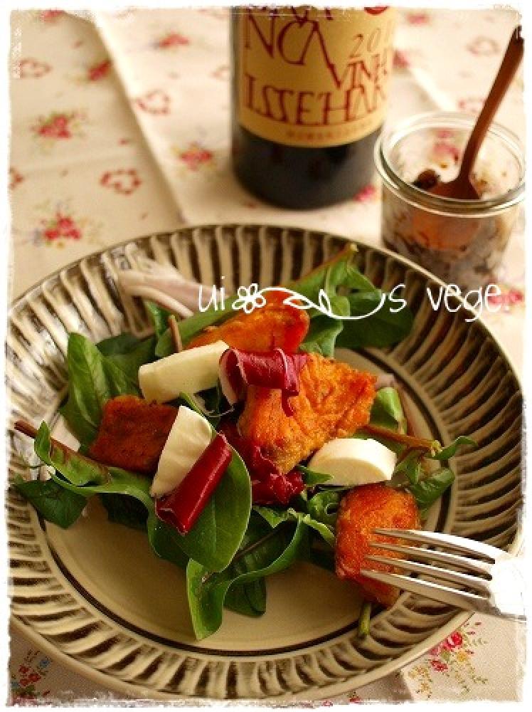 ![]() お皿に野菜を乗せ、その上に焼いたサーモン、モッツアレラを乗せて出来上がり。