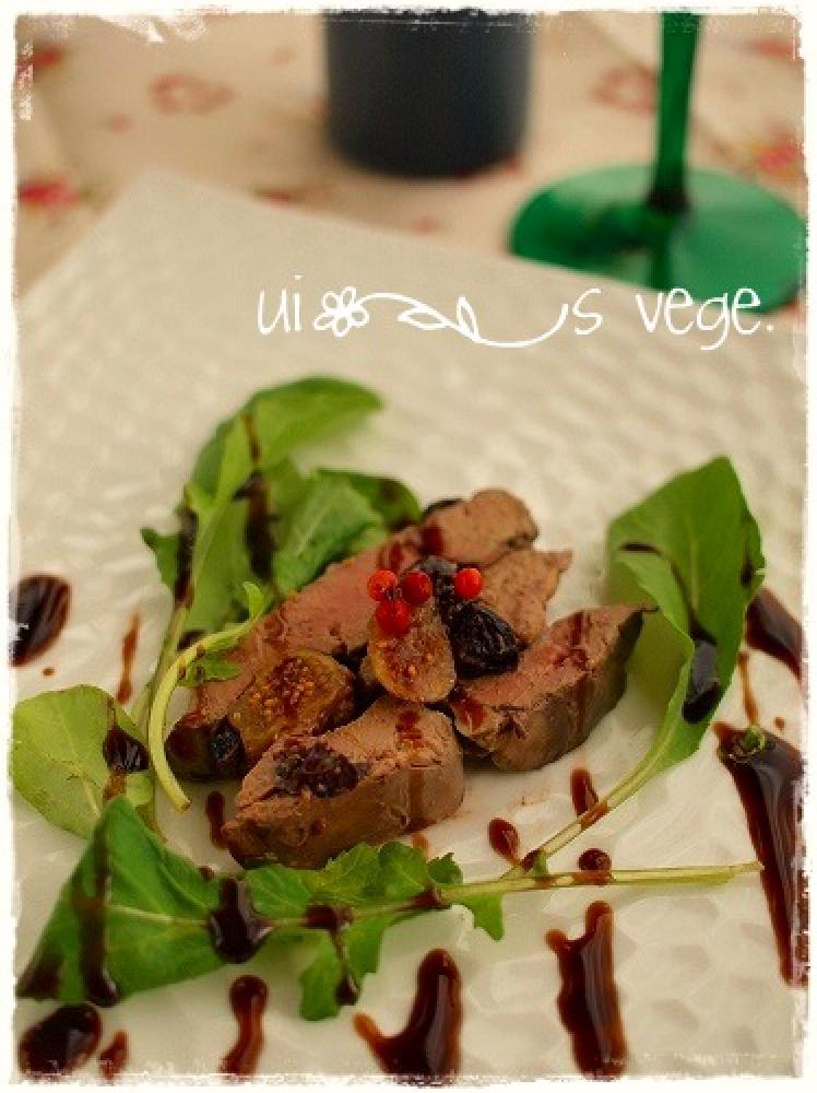 レバーの間にフルーツを挟むように置いて敷いたオーブンシートで包むように蓋をして160度のオーブンで40~45分焼く。