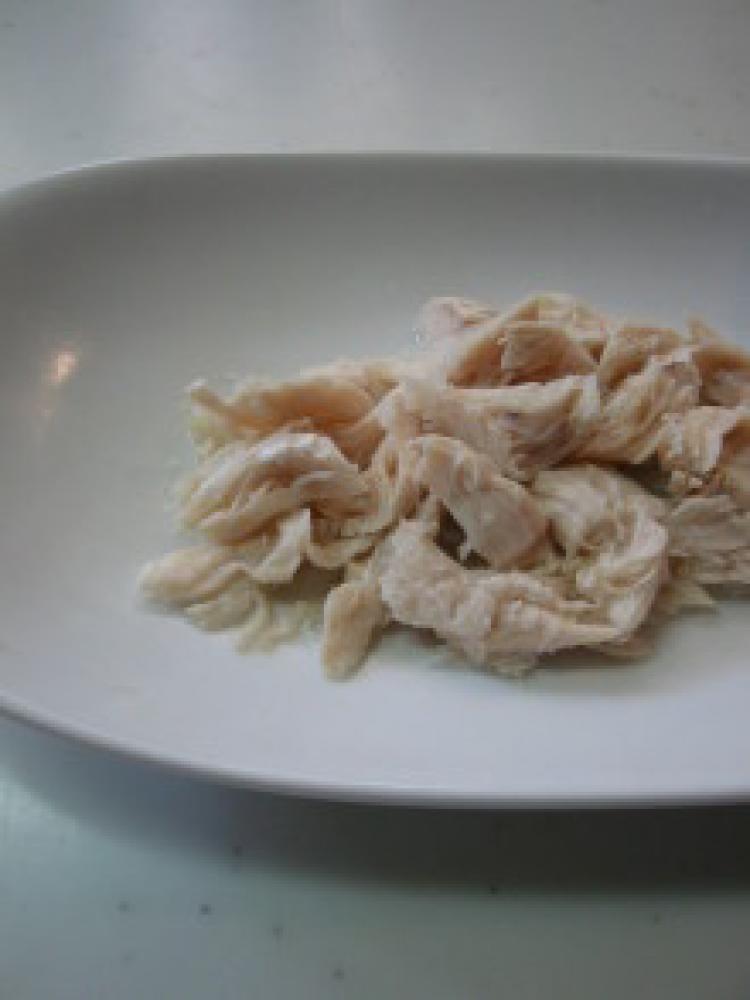 ![]() 火が通ったら手でほぐして皿に戻し、ラップをかけておきます。