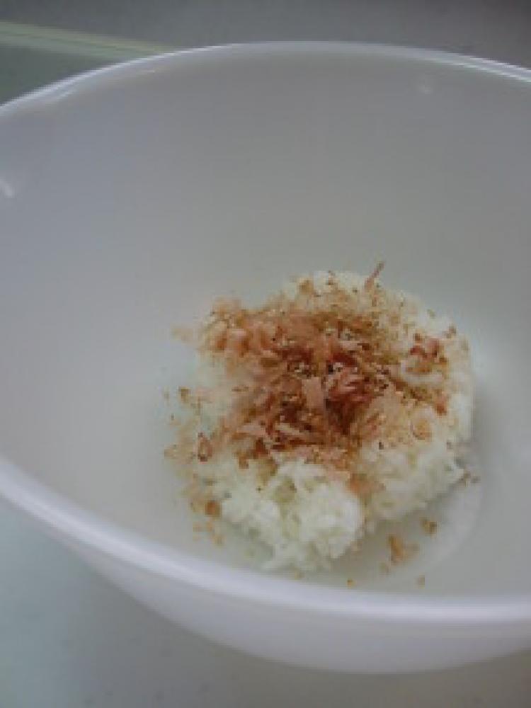 ![]() ごはんにお好みの具材を混ぜ込み、醤油をまぶします。