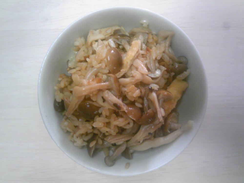 ③にお米、マンナンヒカリを加え、鶏肉、あげ、しめじを加え炊く。