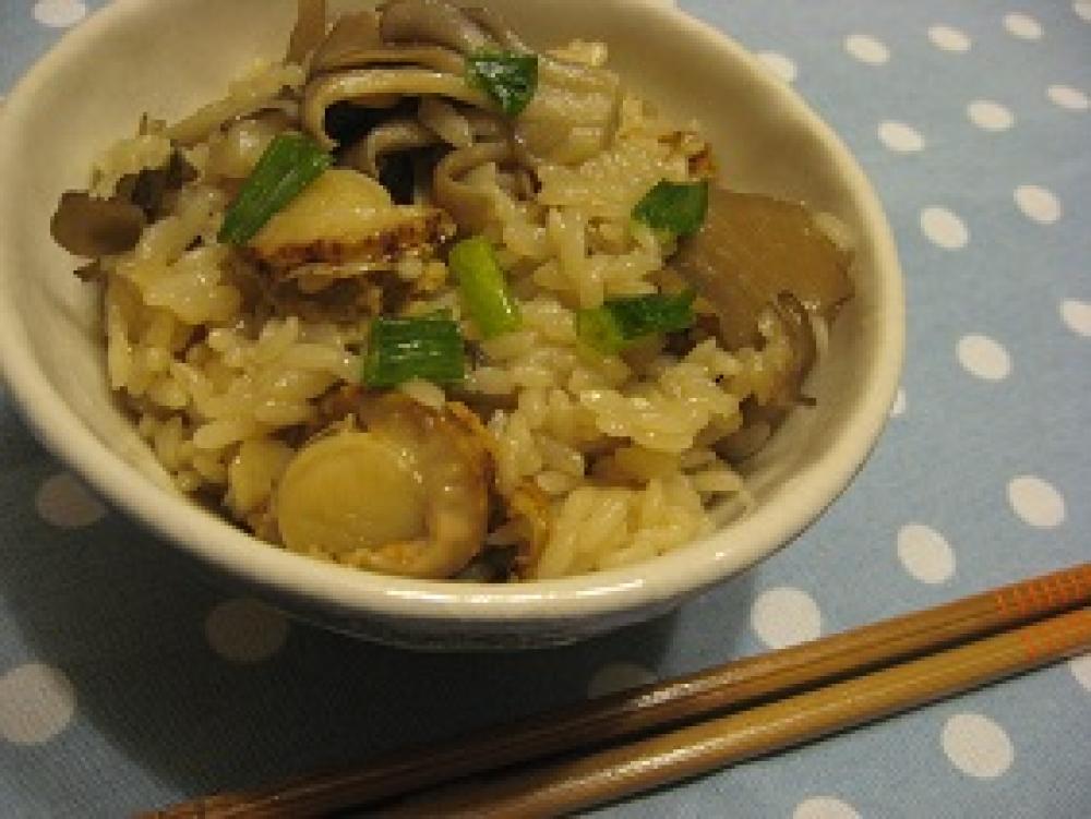炊飯器にお米、マンナンヒカリ、しょうゆ、酒、だし汁を入れ混ぜる。まいたけ、ベビー帆立を乗せ炊く。