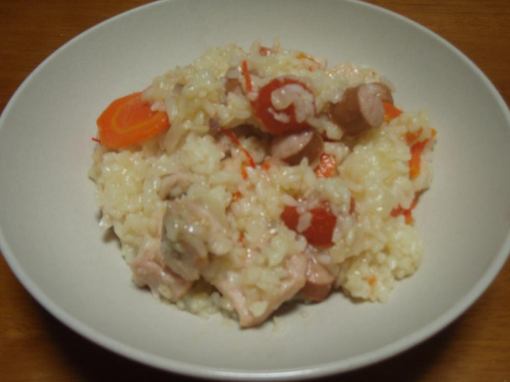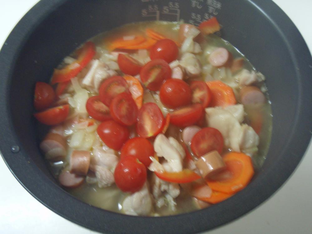 ![]() 焼き色がついたら、たまねぎ・ソーセージ・にんじん・パプリカの順に炒め合わせ、ミニトマトと一緒に炊飯器に加えて炊く。
