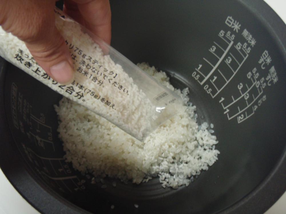 ![]() 米1合を洗い、マンナンライフ1合を合わせ、2合分より少し多めの水を入れる。固形ブイヨンはくずし入れる。