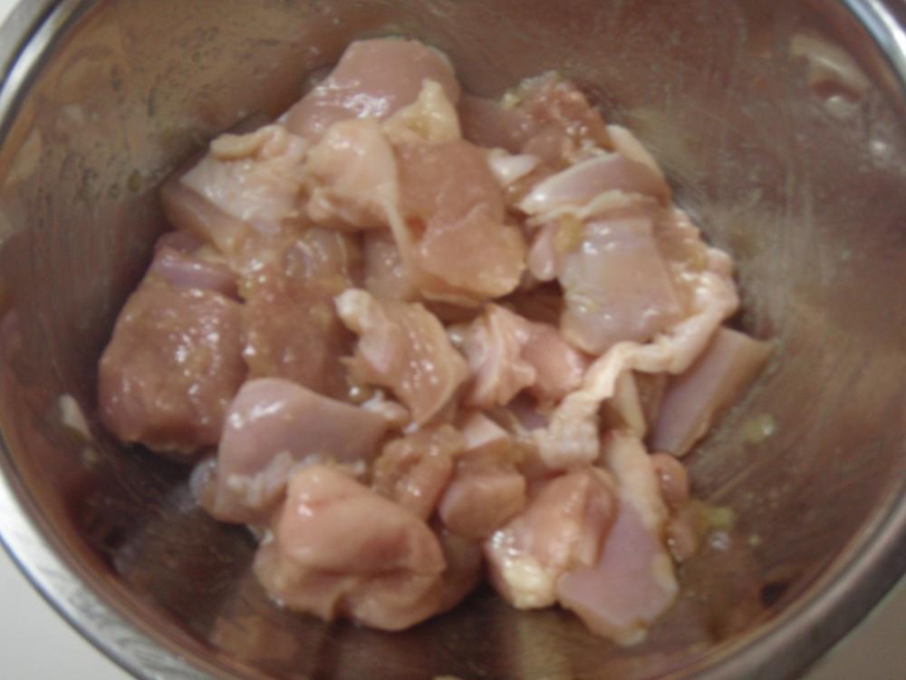 ![]() ①鶏もも肉は一口大に切り分け、オリーブオイル、にんにくのすりおろし大さじ1、塩こしょう少々を揉みこむ。
