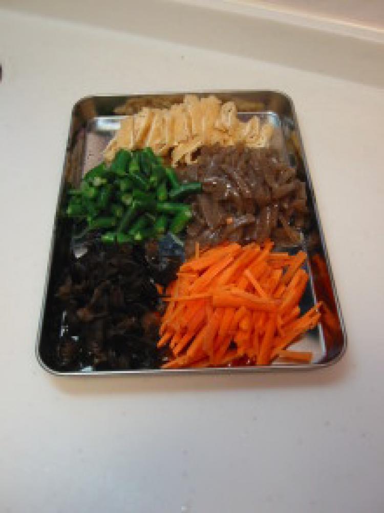 ![]() 下準備①:きくらげは水で戻し、食べやすい大きさにカットする。