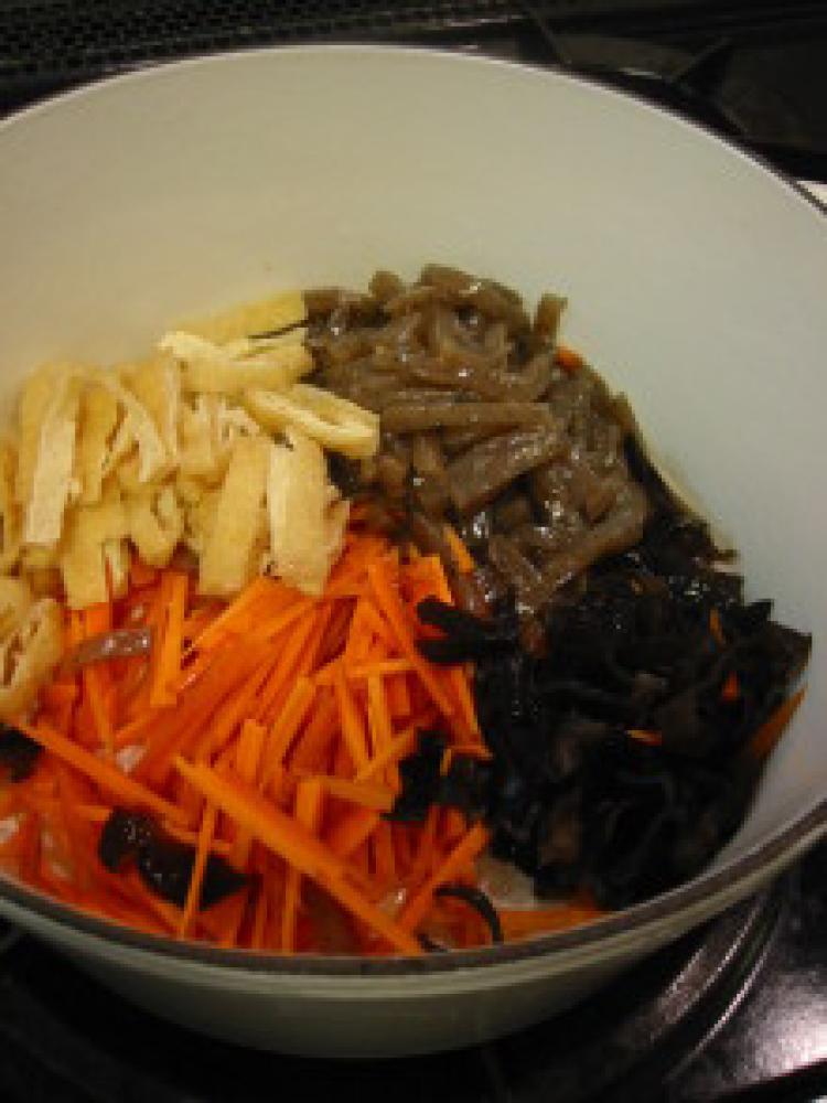 ![]() 鍋にごま油を引き、油揚げ・人参・こんにゃく・きくらげ投入☆